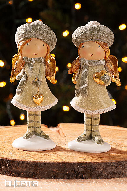 Dwa aniołki w berecie przypominającym żołądź zerwany z drzewa. Figurka wróżki to w rzeczywistości lalka z warkoczykami, trzymająca w dłoniach serce. Jej sukienka jest błyszcząca i wykończona koronką. Skrzydła i serce są złote. Oferujemy aniołki w formie mixu – jeden trzyma serce na piersi, a drugi ma serce spuszczone na sznurku aż do sukienki. Oba aniołki są uśmiechnięte i przywołują zimowo-świąteczny nastrój.