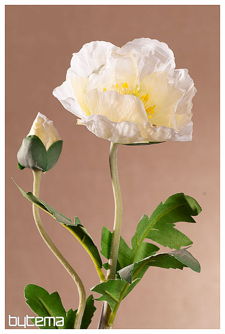 Mak z białym kwiatem i jednym pąkiem. Na łodydze o długości 69 cm znajduje się kilka liści. Kwiat można łatwo pomylić z prawdziwym makiem, który rośnie na łąkach i polach, ze względu na sposób jego przetwarzania.