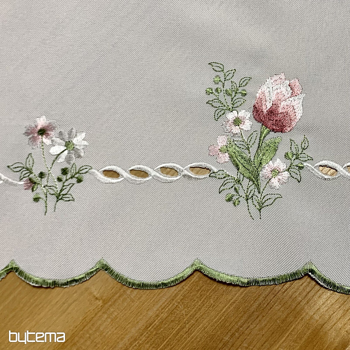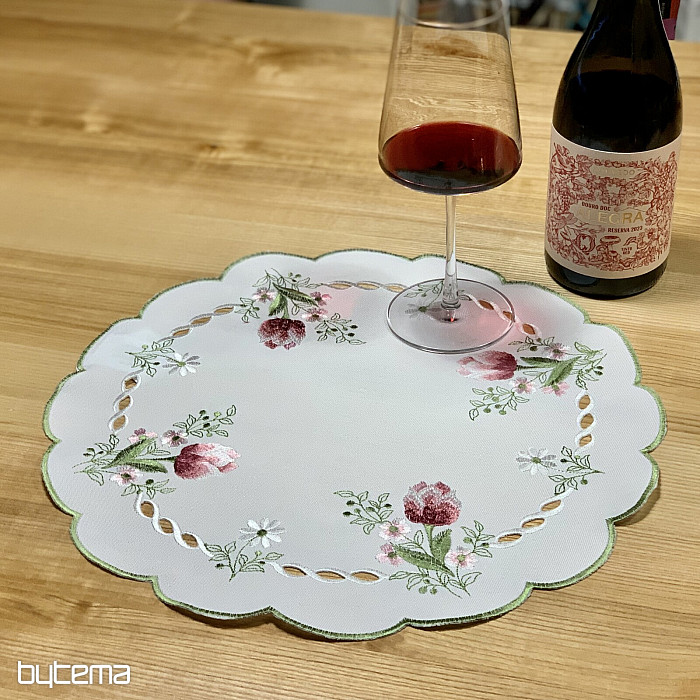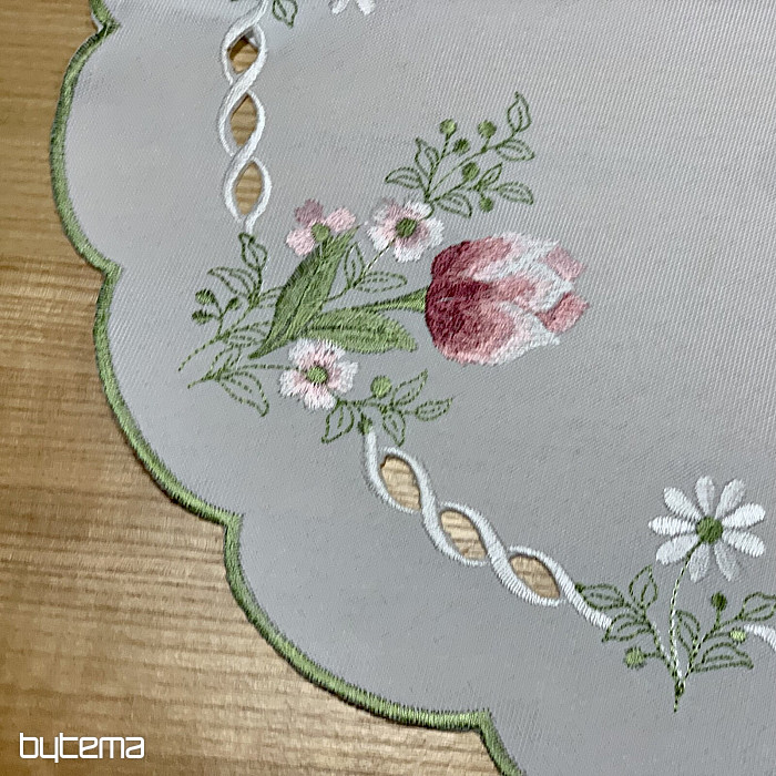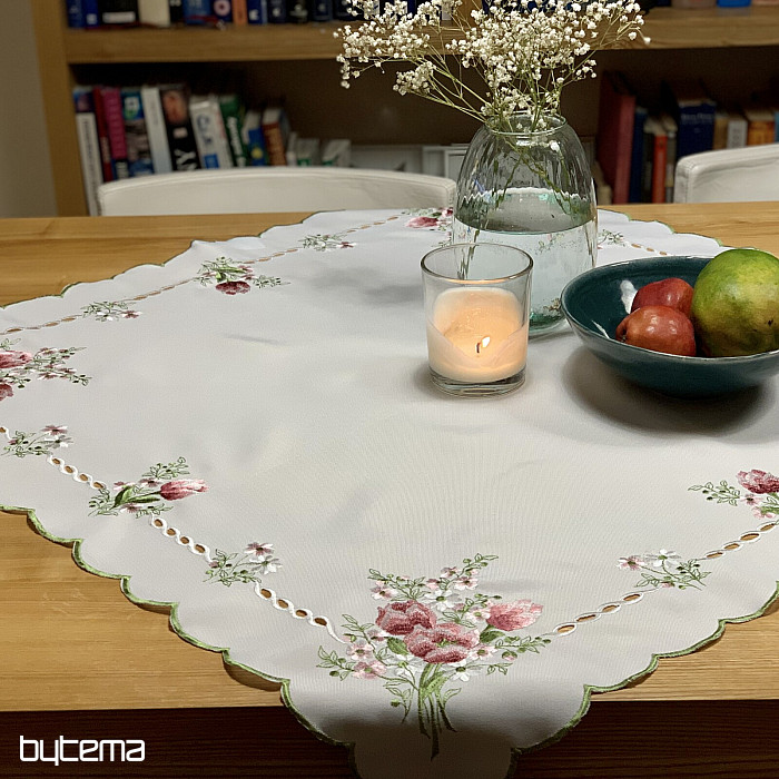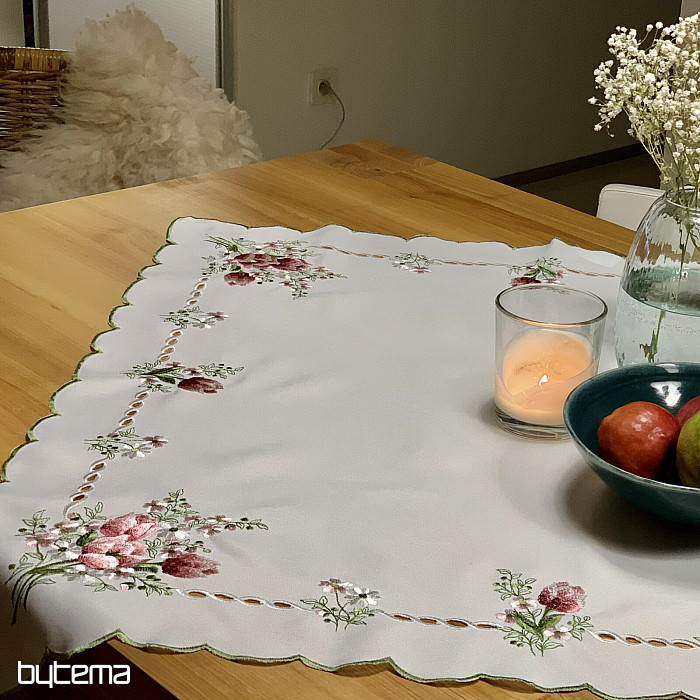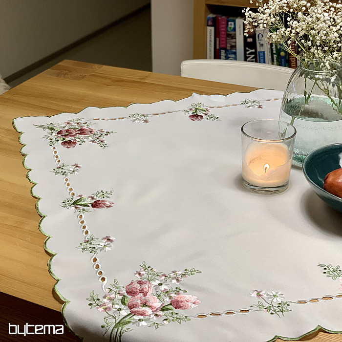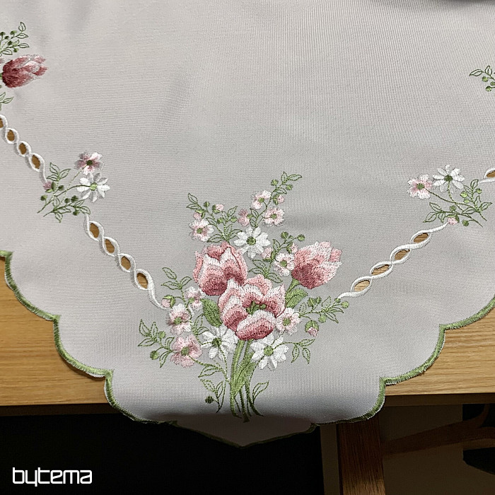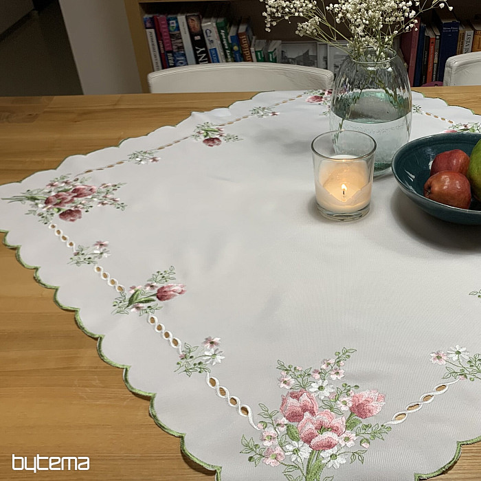 Piękny haftowany obrus z motywem bukietu różowych tulipanów.