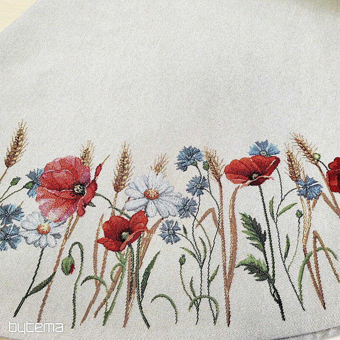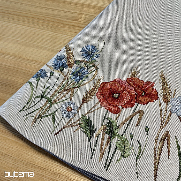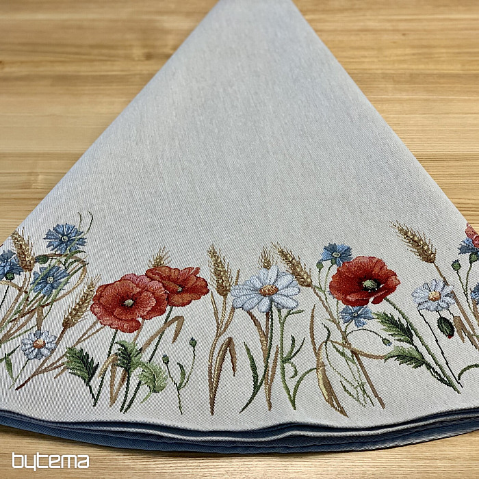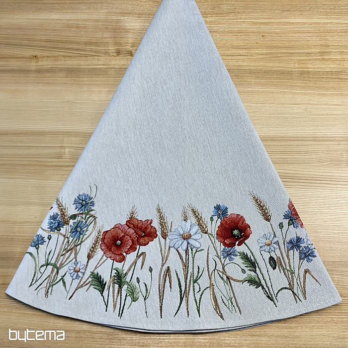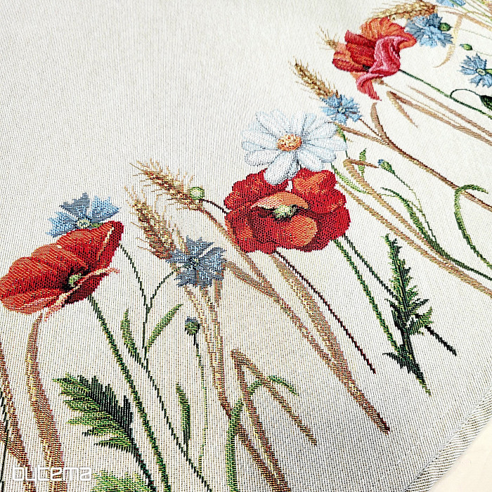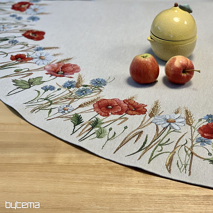 Piękny, okrągły obrus wykonany z wytrzymałej tkaniny gobelinowej z nutą letnich dni i polnych kwiatów. Idealna miękkość na letnie dni na Twoim stole w domu.