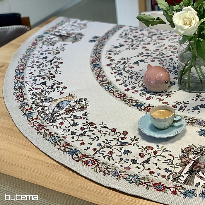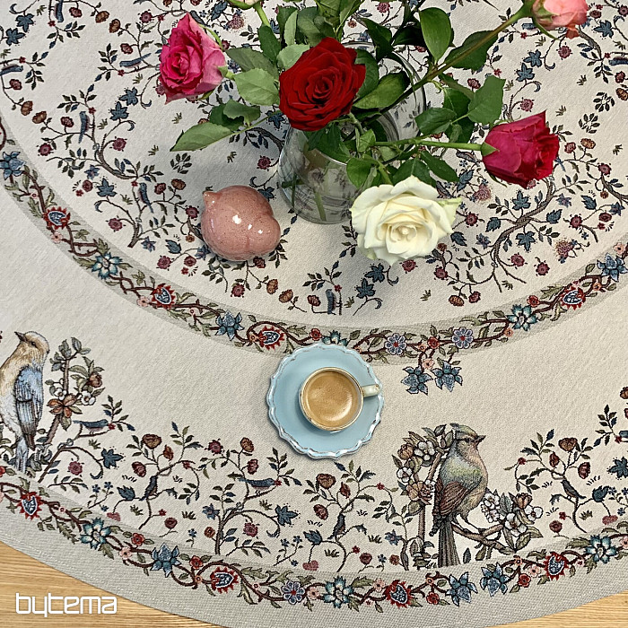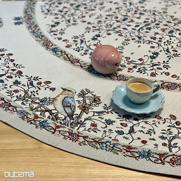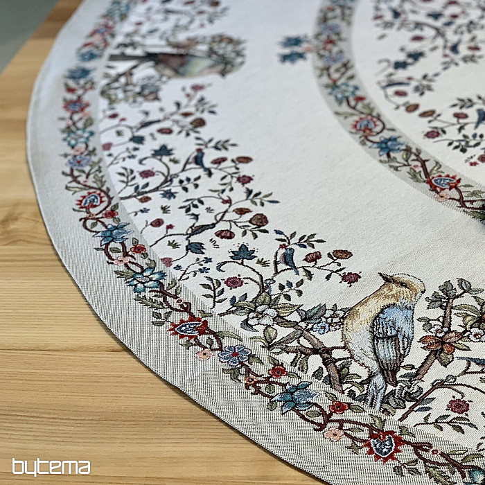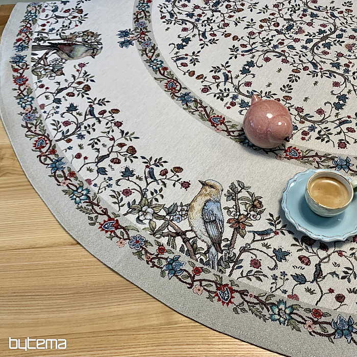 Piękny, okrągły obrus wykonany z wytrzymałej tkaniny gobelinowej z ptakami i kwiatami w różnych kolorach. Idealny dodatek lub prezent dla miłośników ptaków.