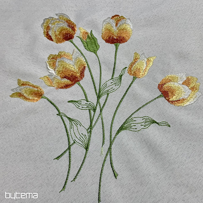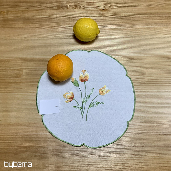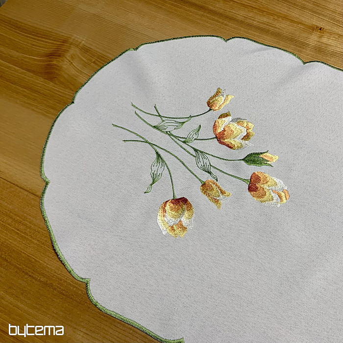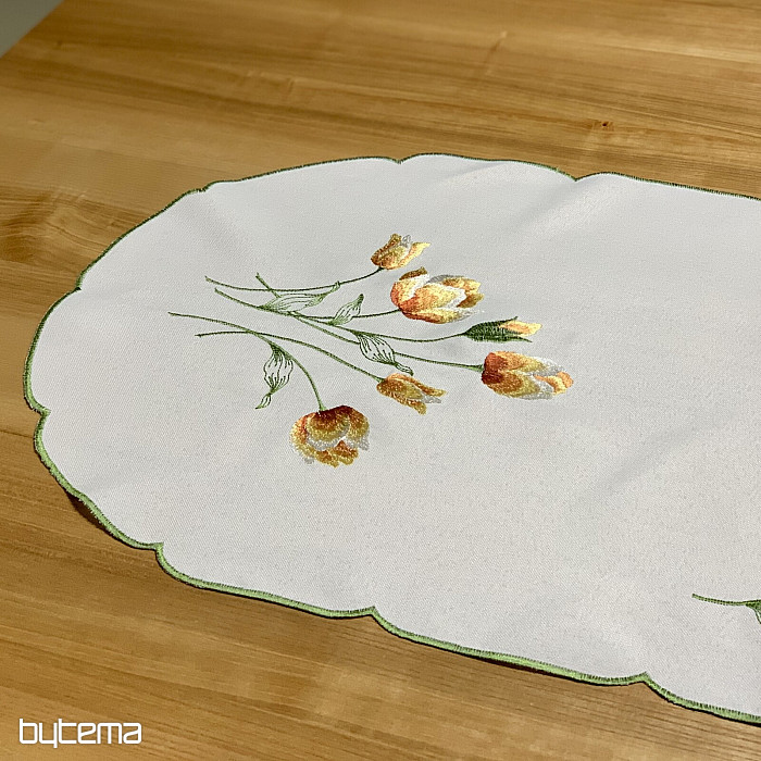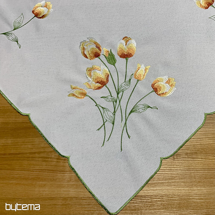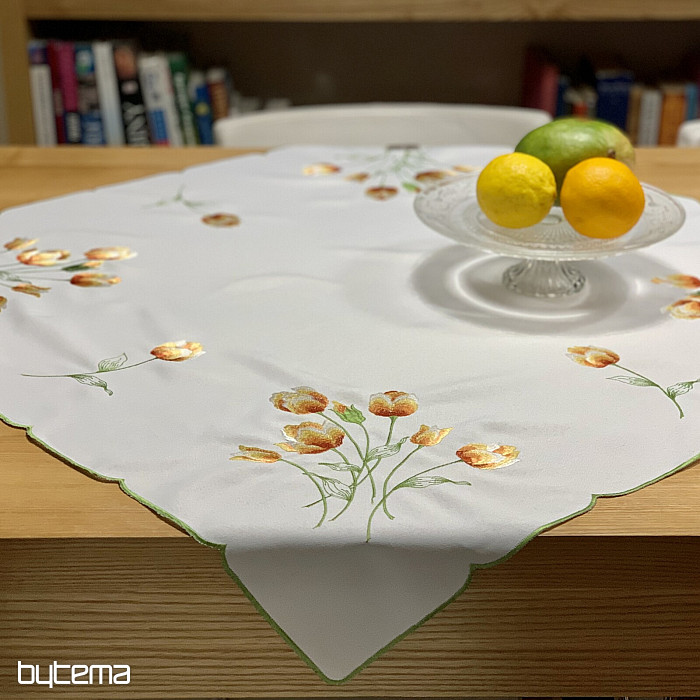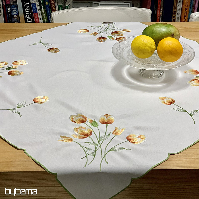Haftowany obrus i szalik z motywem pomarańczowych tulipanów, piękny haft ulubionych wiosennych kwiatów.