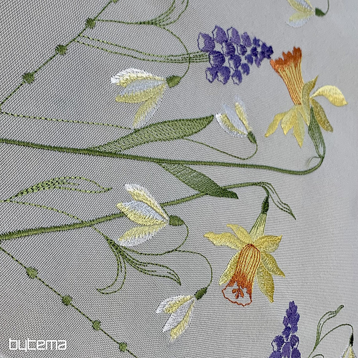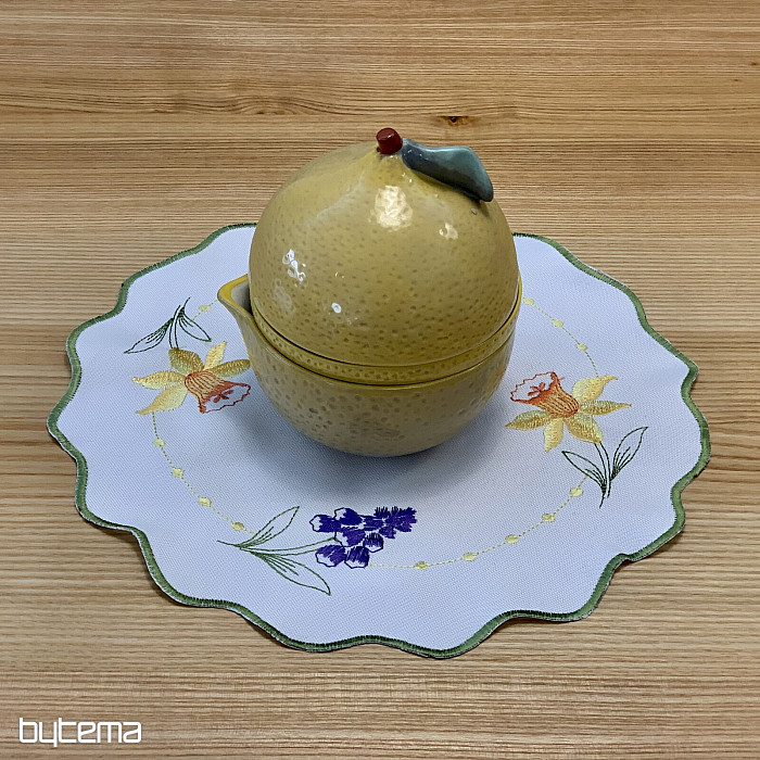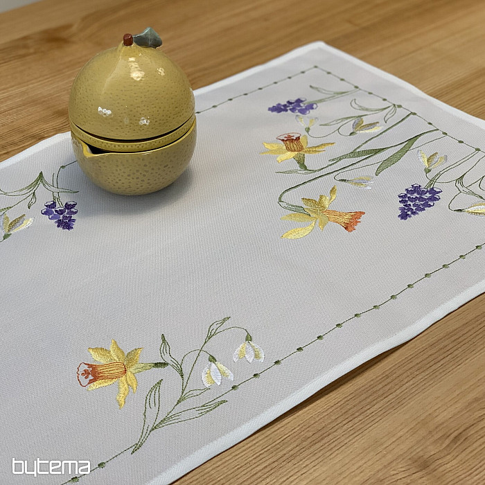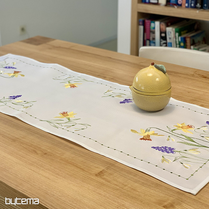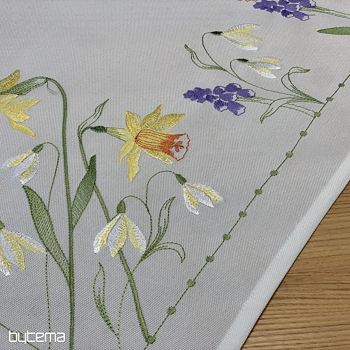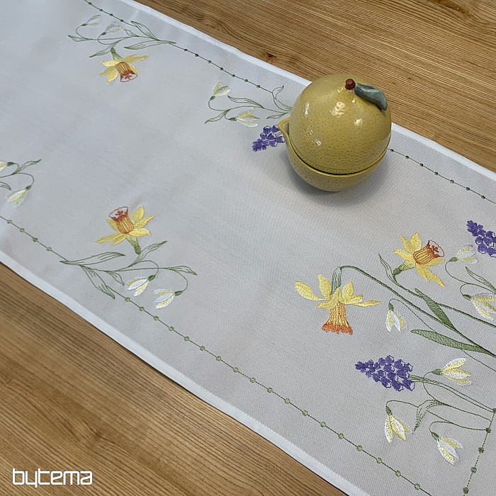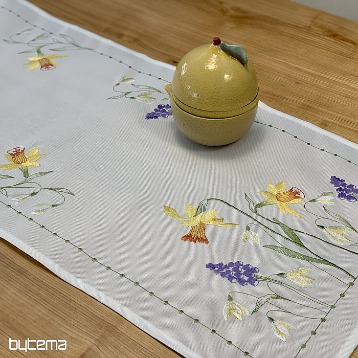 Haftowany obrus i szalik z motywem żonkili, przebiśniegów i morw - wiosenny motyw, który nigdy się nie starzeje.