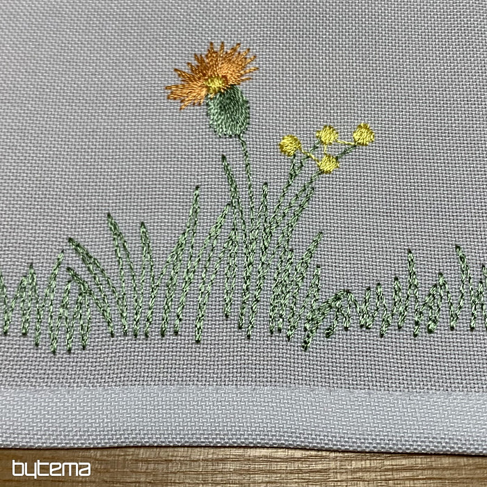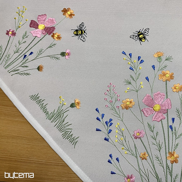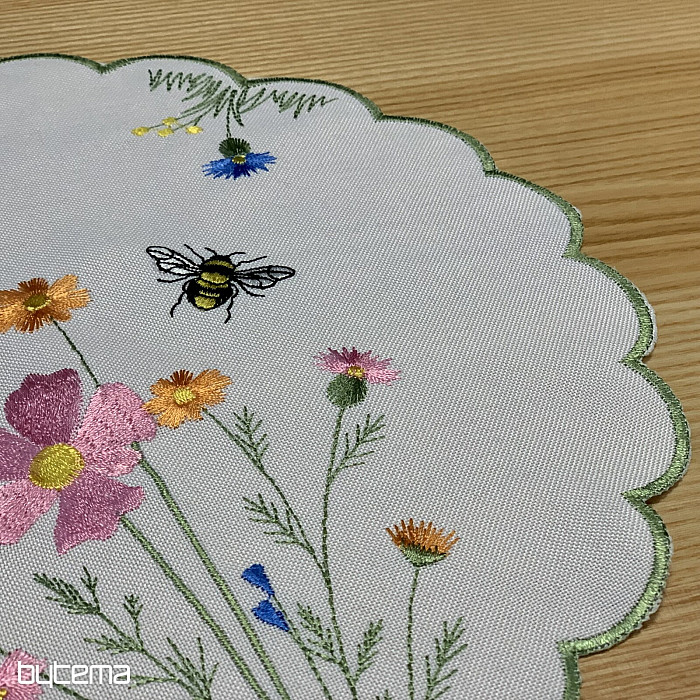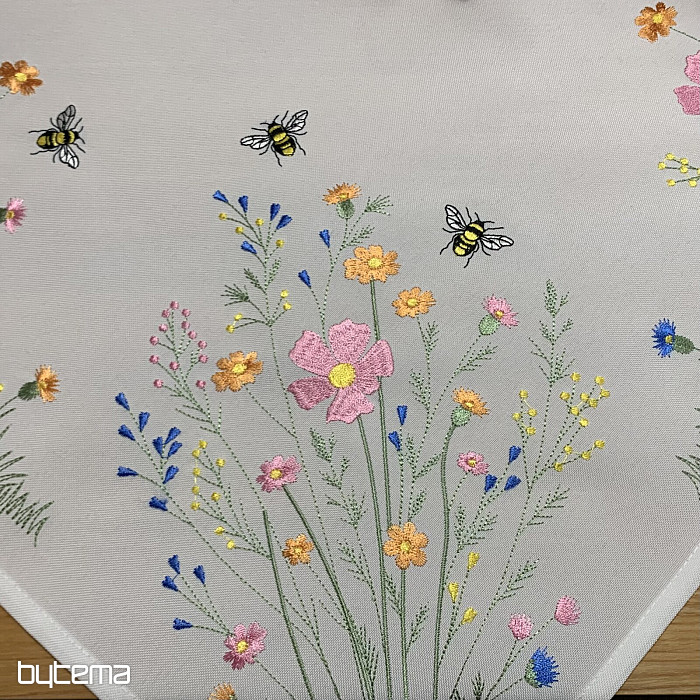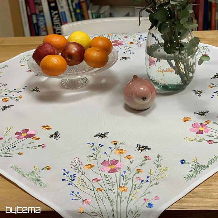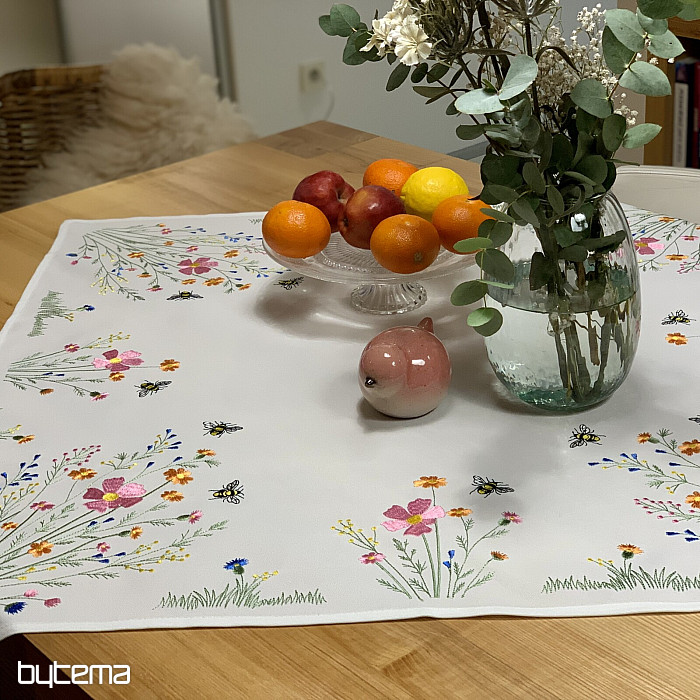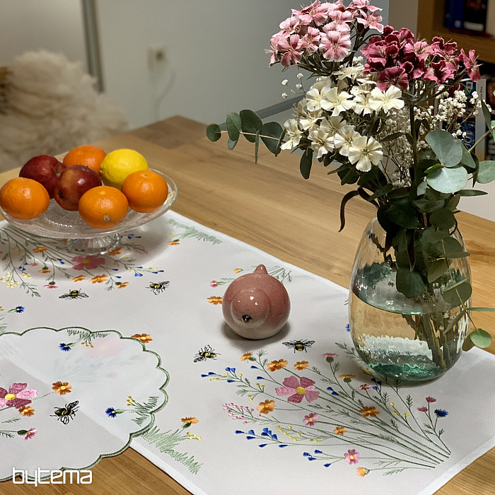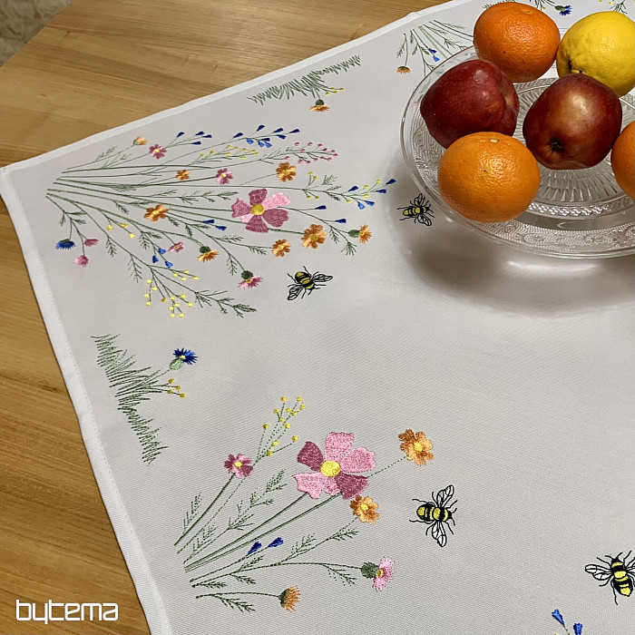 Delikatny haftowany obrus i szalik z motywem kwitnącej łąki z pszczołami.