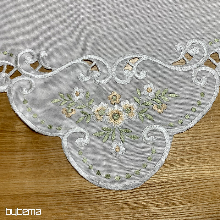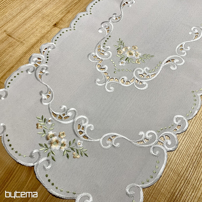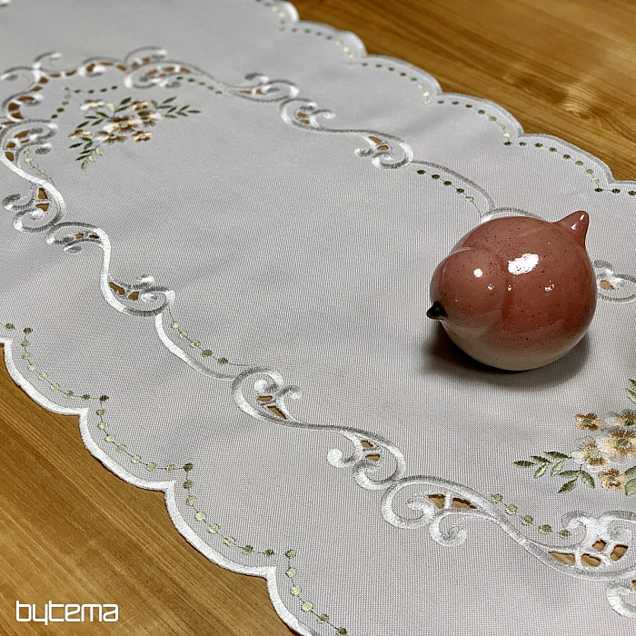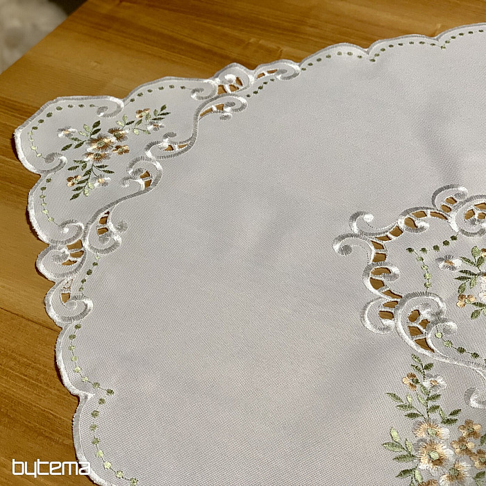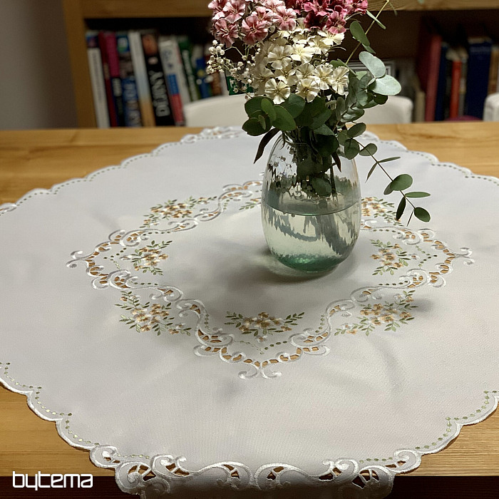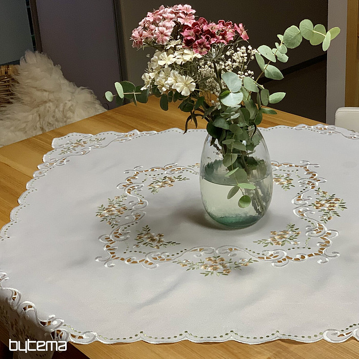 Delikatny obrus haftowany ażurowo, odpowiedni na uroczyste okazje.