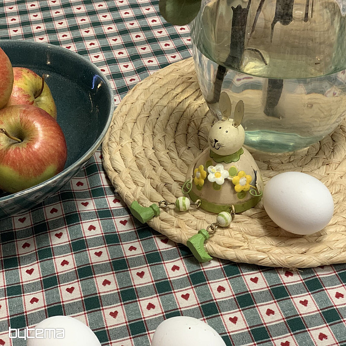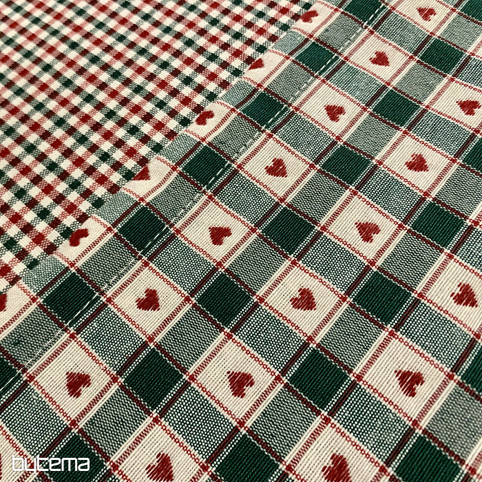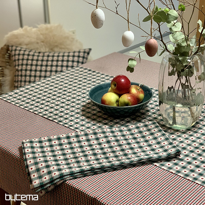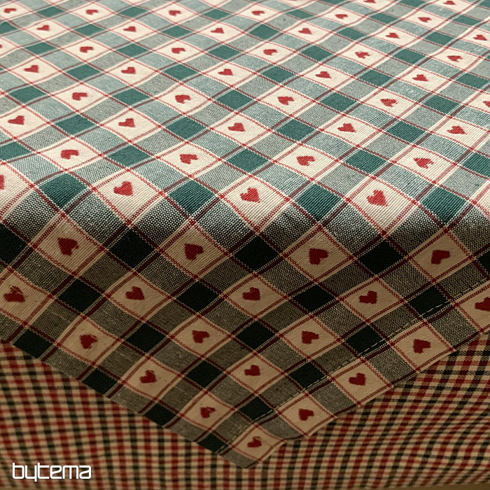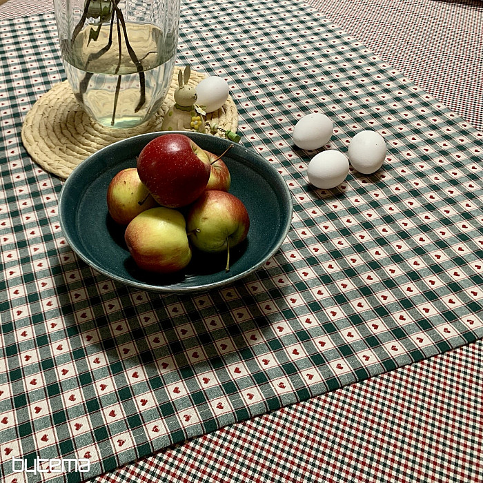 Dekoracyjny obrus i szalik w kratkę i serca doskonale sprawdzą się w wiejskich domkach i chatach z bali.