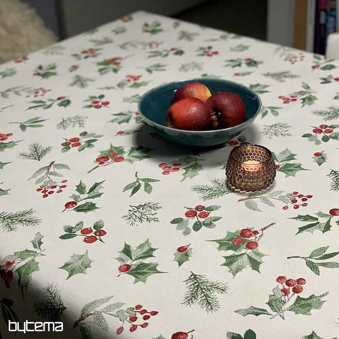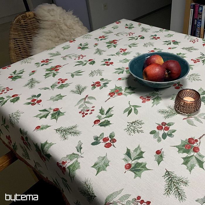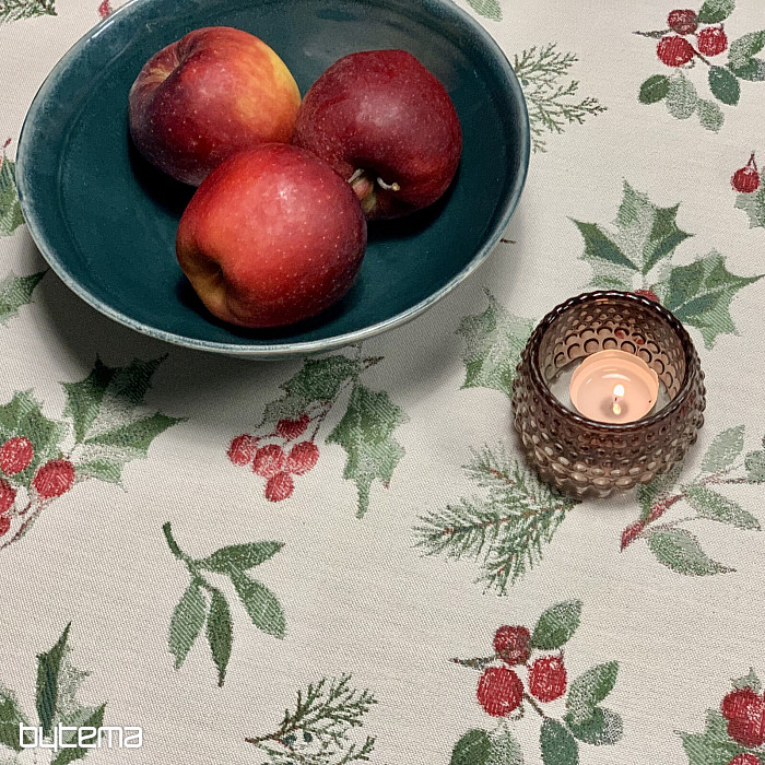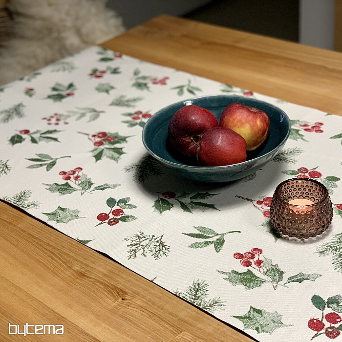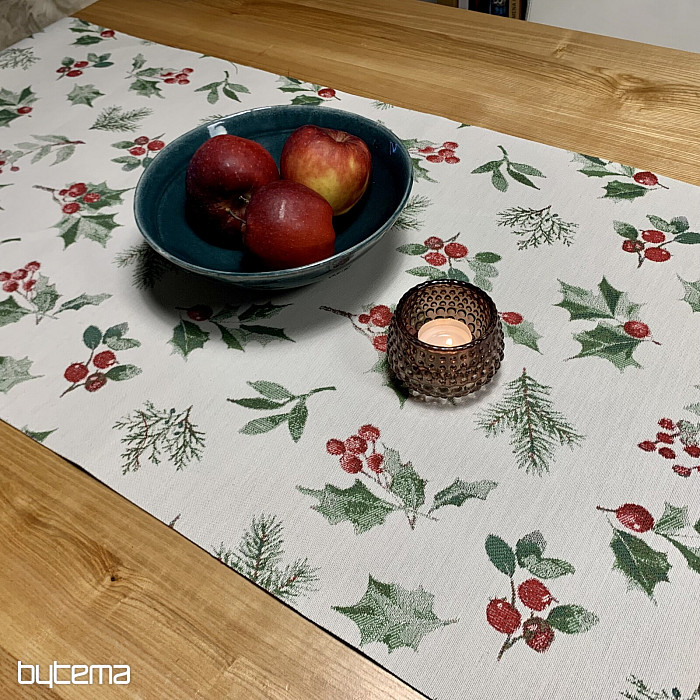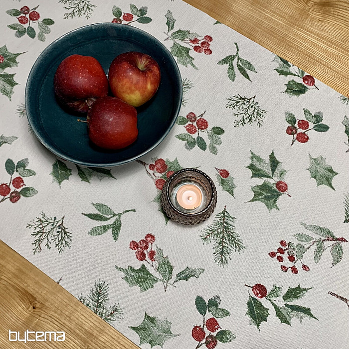 Świąteczny obrus lub szalik wykonany z luksusowej tkaniny z ostrokrzewem i czerwonymi jagodami, symbolem Bożego Narodzenia, sprawdzi się w każdym wnętrzu, szczególnie w chłodniejszej porze roku.