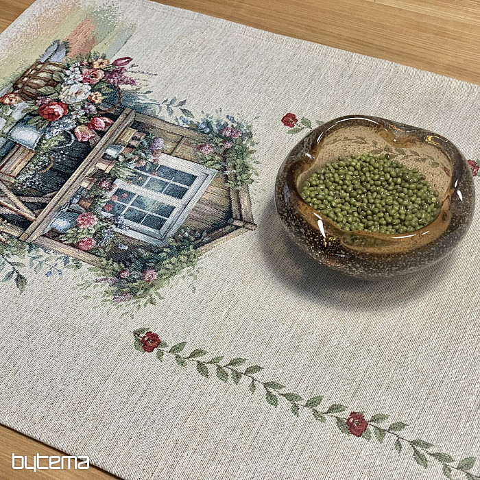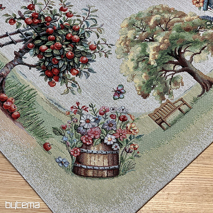 Obrus i szalik z gobelinu z domkiem w ogrodzie pełnym kwiatów. Na pierwszy rzut oka wzór emanuje wiosennym komfortem i ciepłem.