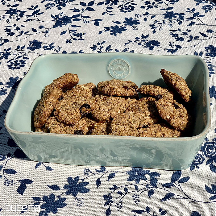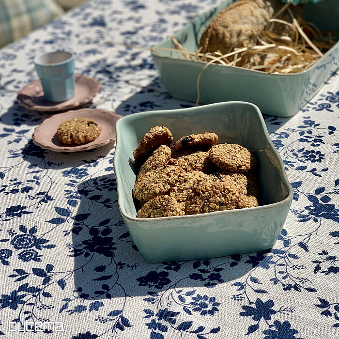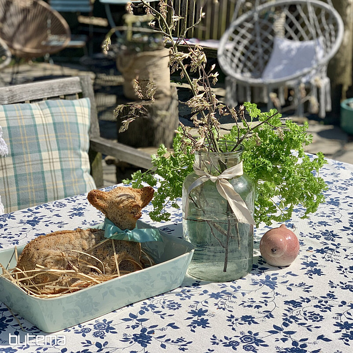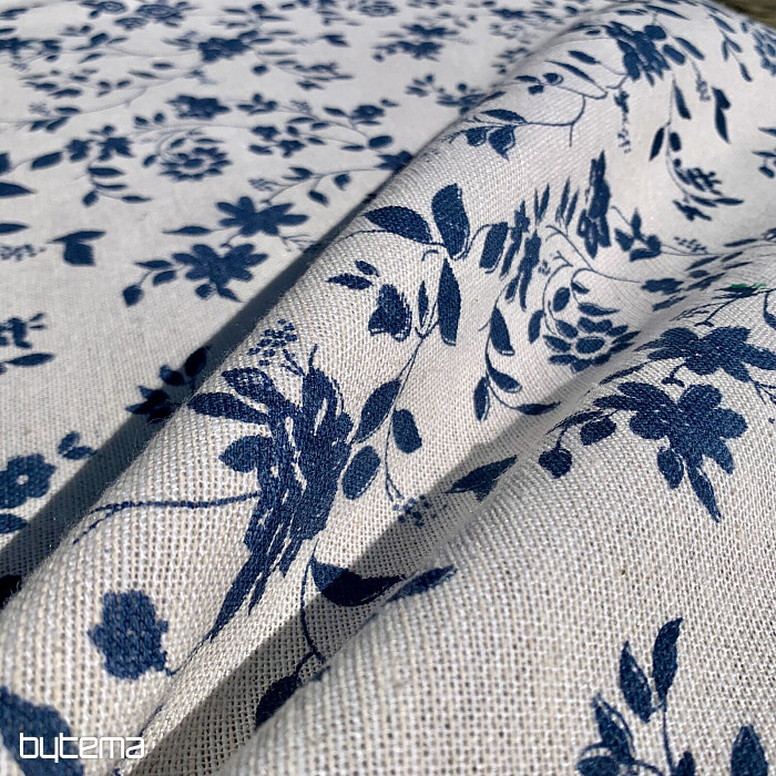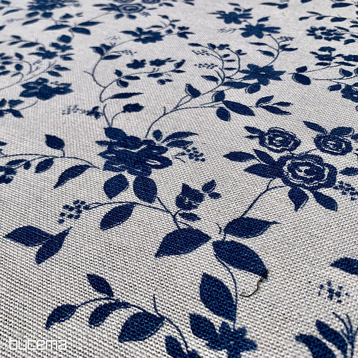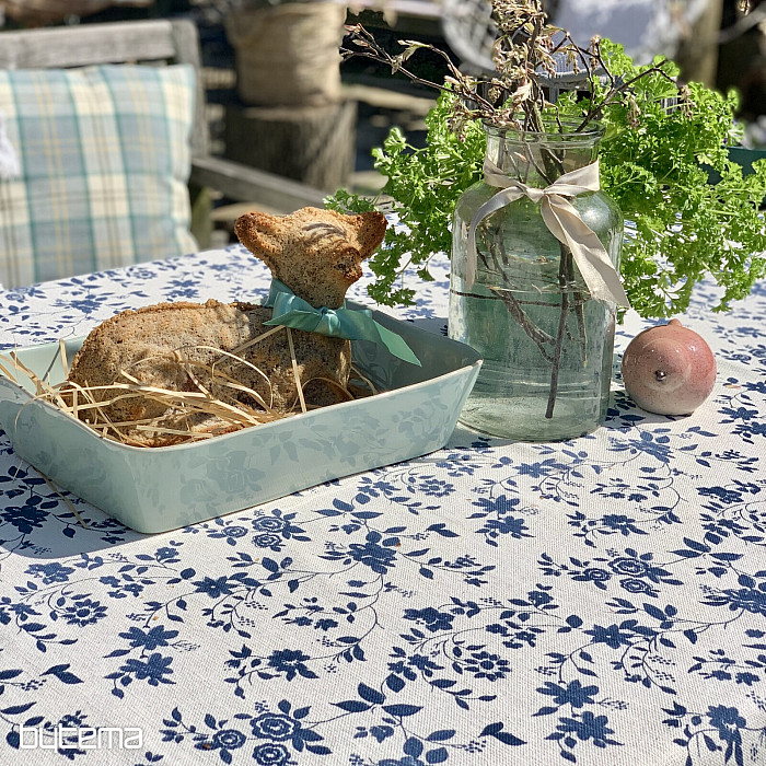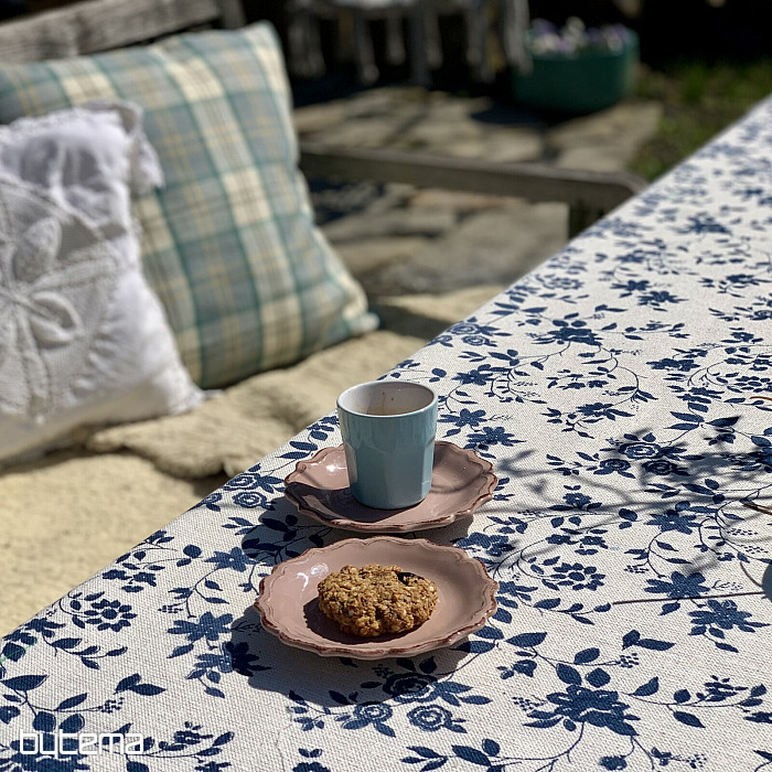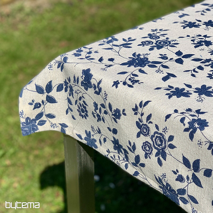 Piękny wzór ciemnoniebieskich kwiatów na kremowym tle i wyjątkowy materiał z domieszką lnu – luksusowy obrus BLUE ROMANCE.