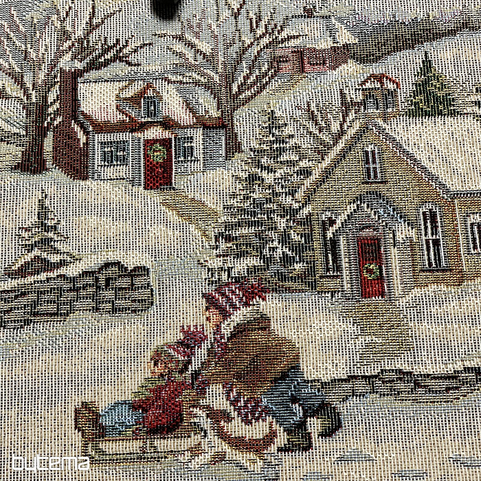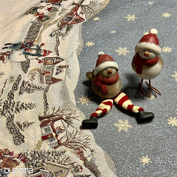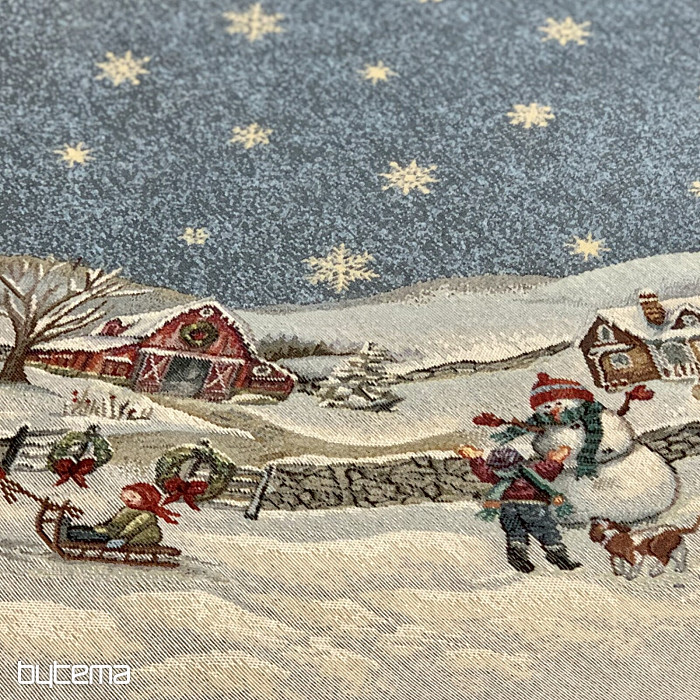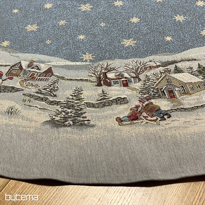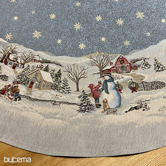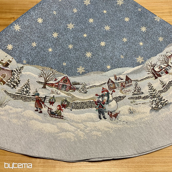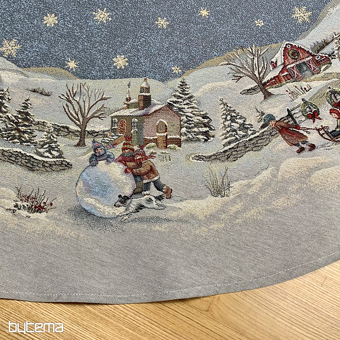 Piękny, okrągły obrus gobelinowy z idealnym zimowym motywem pełnym dziecięcej radości Bożego Narodzenia.