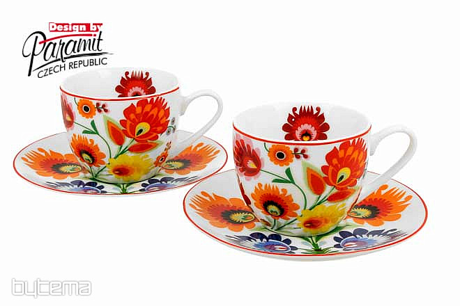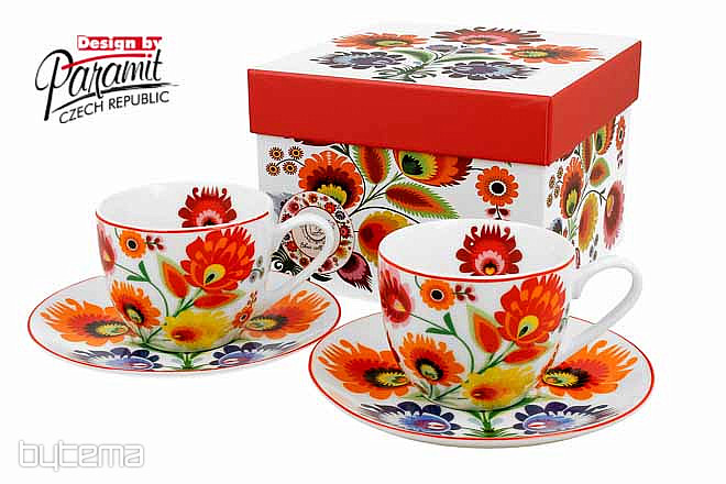Dwie filiżanki i spodeczki zapakowane są w ładne pudełka na prezenty.