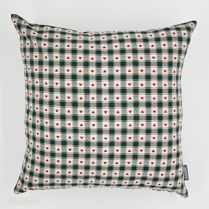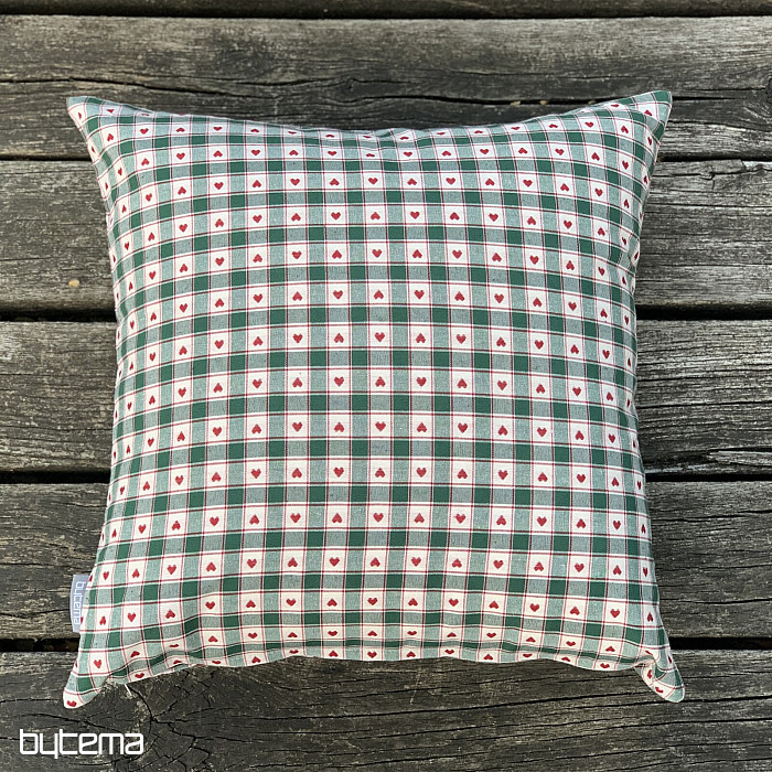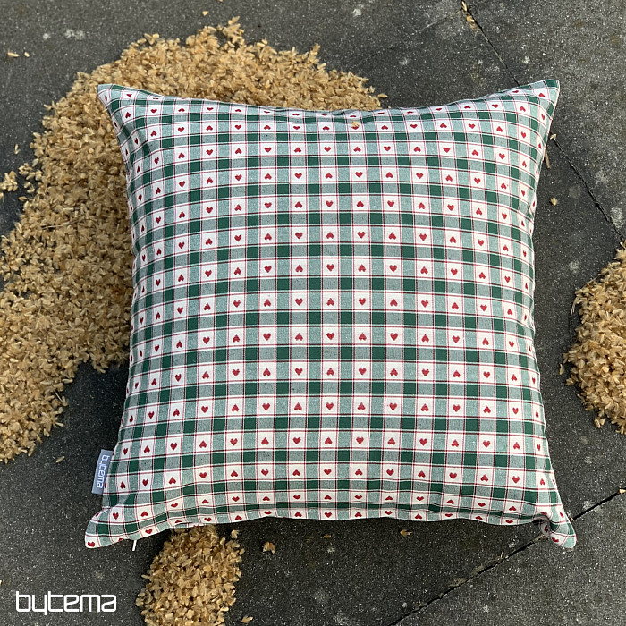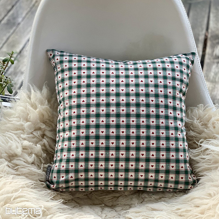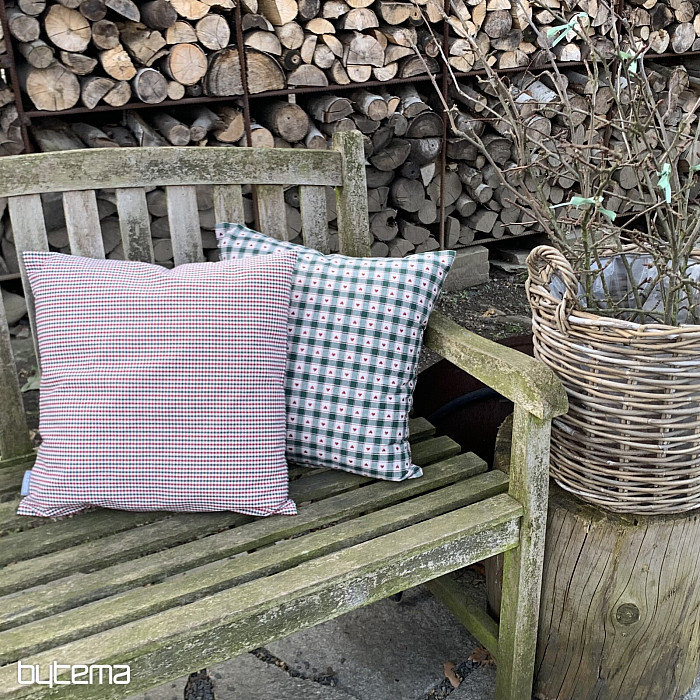 Dekoracyjne poszewki na poduszki ze wzorem szachownicy i serca doskonale sprawdzą się w wiejskich domkach i chatach z bali.