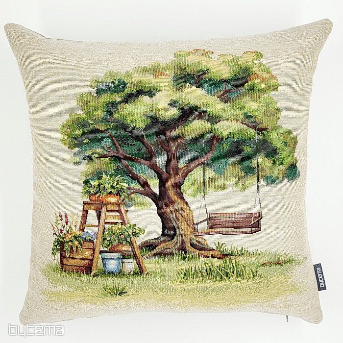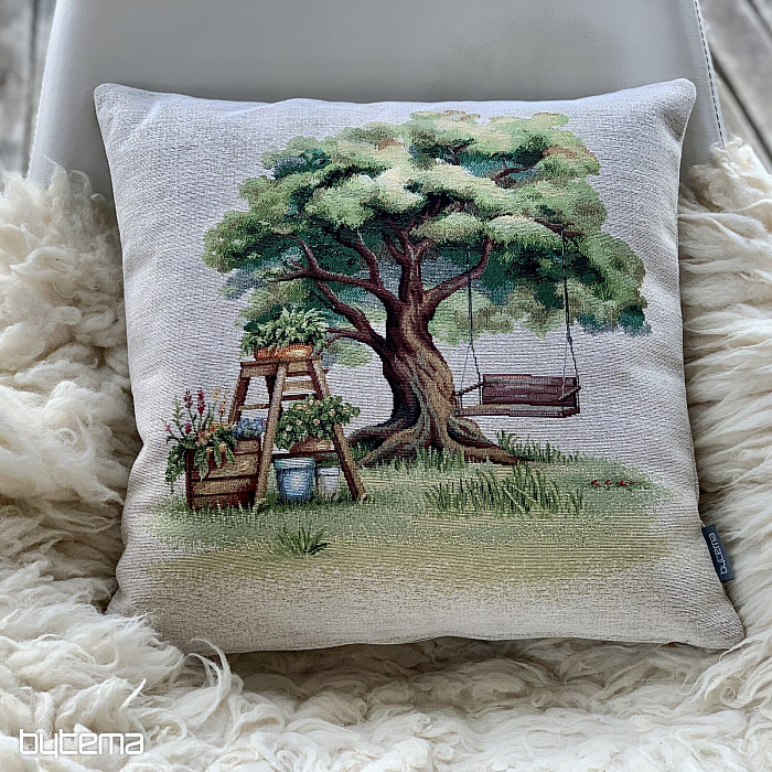 Poszewka na poduszkę z gobelinu z motywem kącika relaksacyjnego. Huśtawka pod koronami drzew to idealne miejsce na relaks.