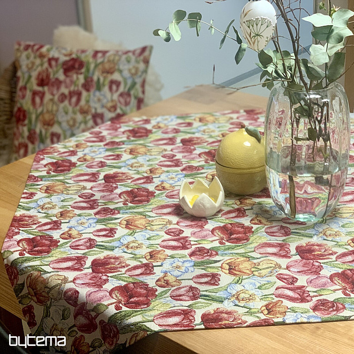 Piękna okładka z gobelinu z wiosennymi kwiatami – tulipanami i żonkilami. Cudowny, kolorowy zalew kwiatów i wiosny w Twoim domu.