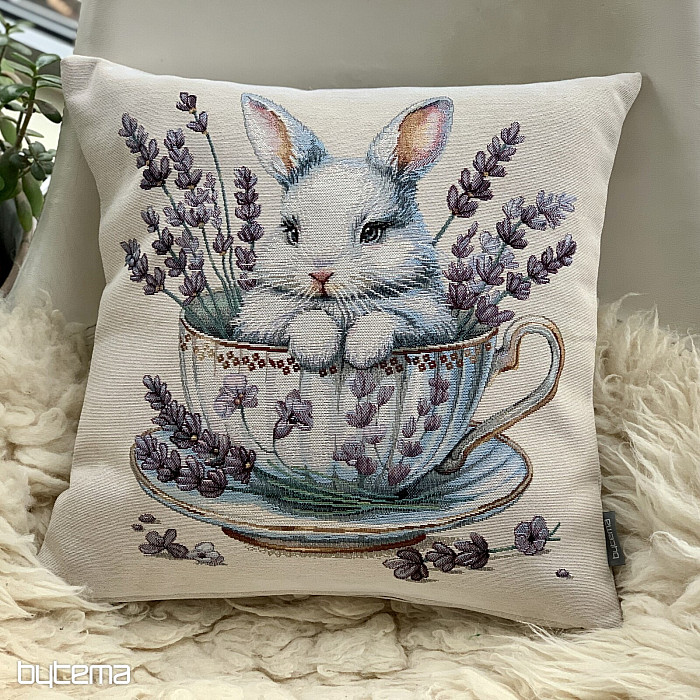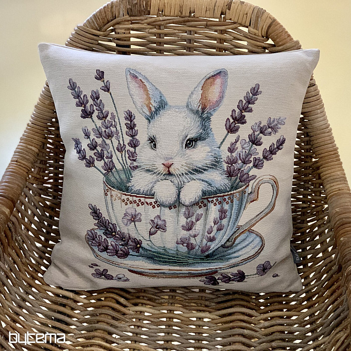 Poszewka na poduszkę z gobelinu z uroczym króliczkiem w porcelanowym serwisie z pachnącą lawendą. Piękna i delikatna dekoracja nie tylko na Wielkanoc.