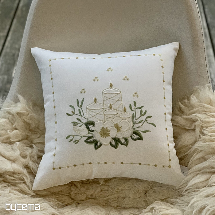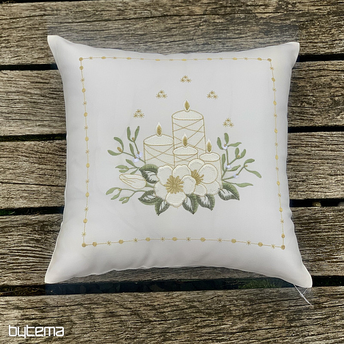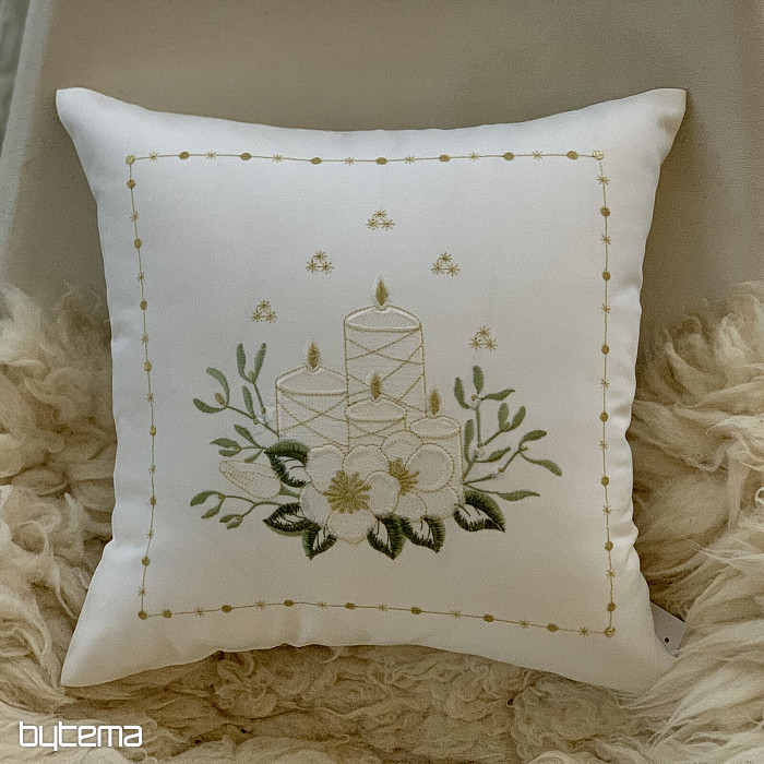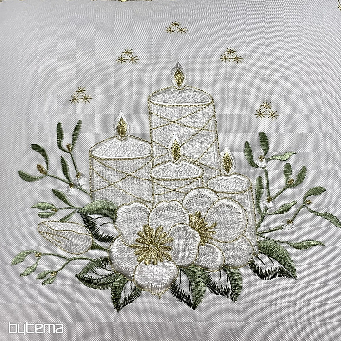 Gustownie i delikatnie haftowana narzuta świąteczna z białymi świecami adwentowymi będzie uroczym dodatkiem do Twojego domu.