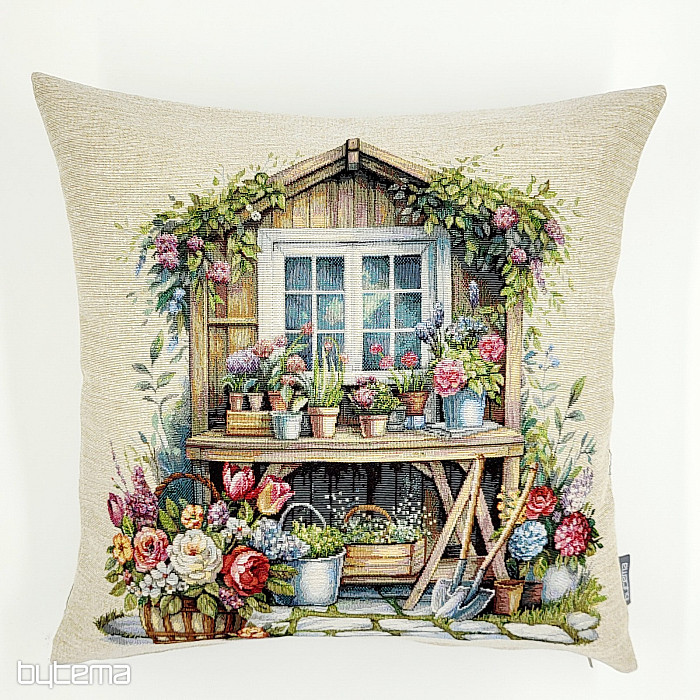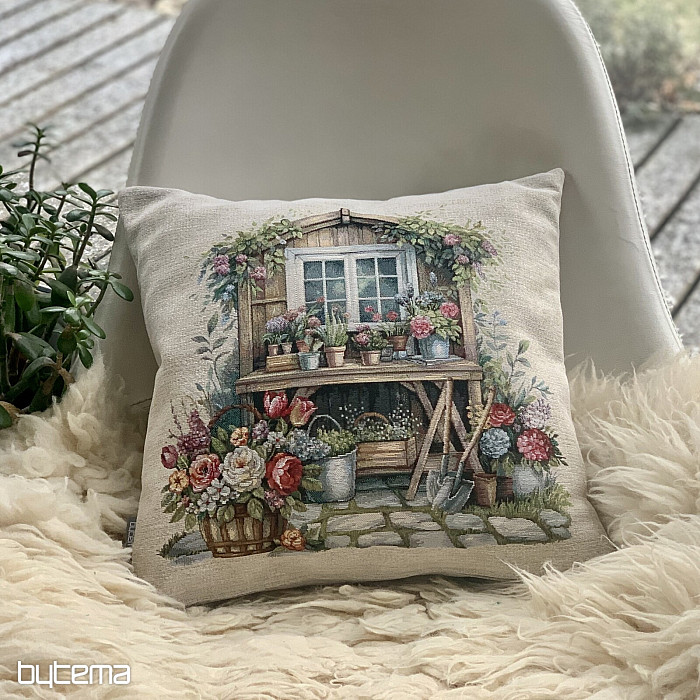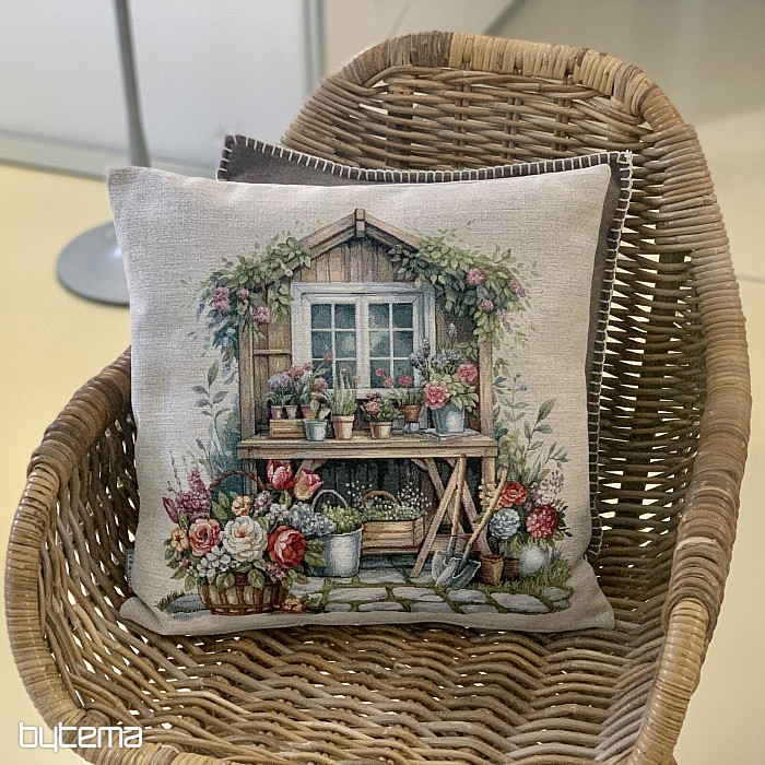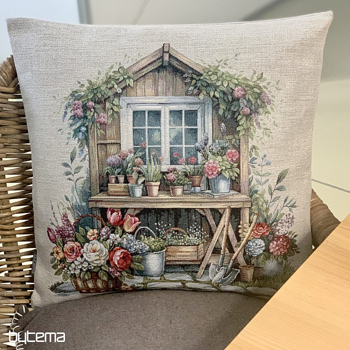 Poszewka na poduszkę z gobelinu z domkiem w ogrodzie pełnym kwiatów. Wzór na poszewce emanuje wiosennym komfortem i ciepłem.