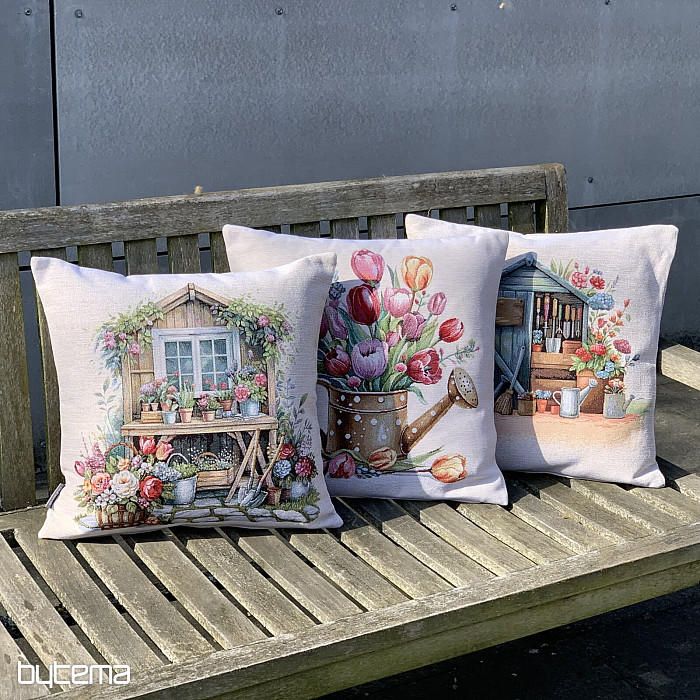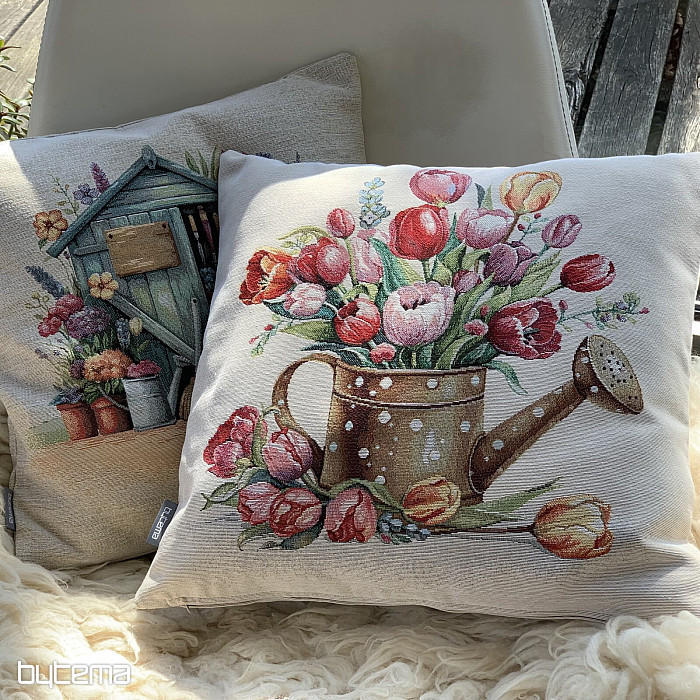 Poszewka na poduszkę z gobelinu z wiosennym bukietem kolorowych tulipanów w czajniczku. Piękna dekoracja na wiosnę w Twoim domu.