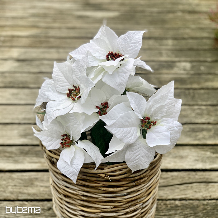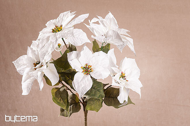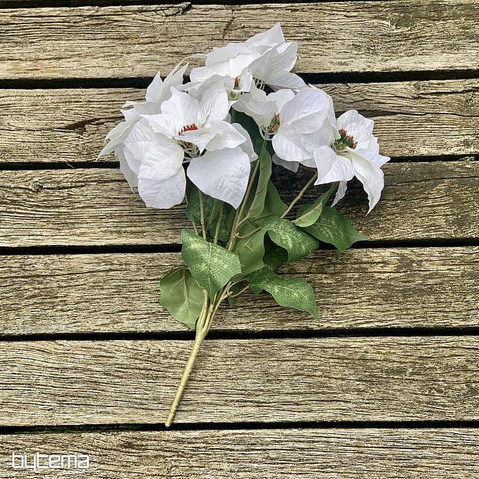 Duży bukiet czerwonych kwiatów o efektownym wzorze. Bogaty bukiet składa się z siedmiu kwiatów i wielu liści. Kwiat wygląda bardzo naturalnie, a dzięki swojemu pięknemu wyglądowi będzie imponującą ozdobą w okresie świątecznym.