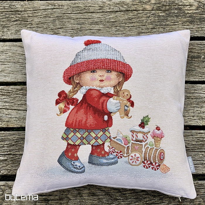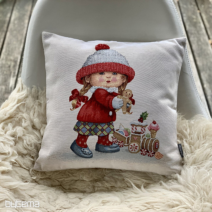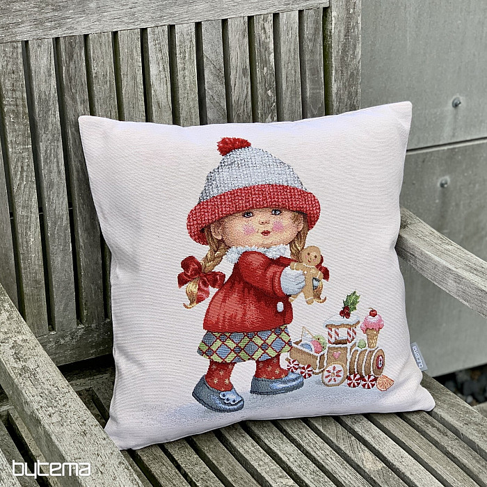 Gobelinowa poduszka dekoracyjna z zimowym motywem DZIEWCZYNKI z zabawką jest magiczna.