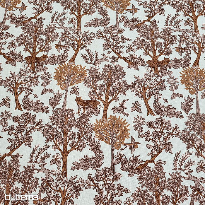 Tkanina z większą zawartością bawełny, przedstawiająca małego geparda ukrywającego się wśród drzew, będzie świetnym wyborem na zasłony lub poszewki na poduszki do pokoju dziecięcego.