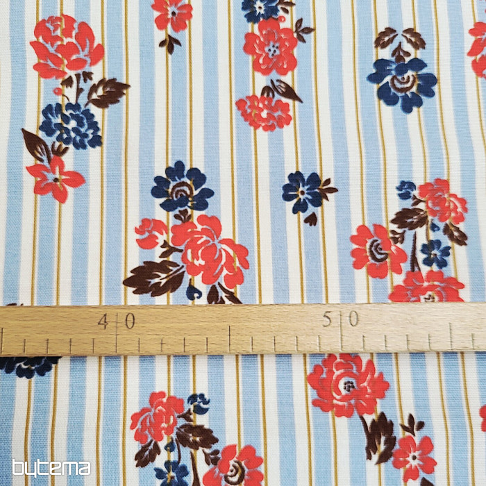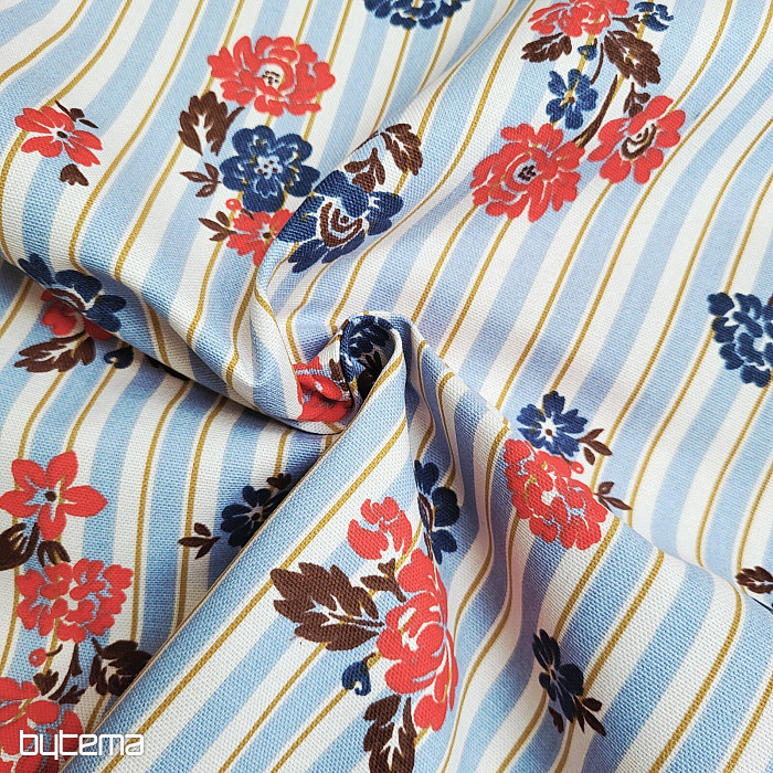 Tkanina o podwyższonej zawartości bawełny, 220 g, z delikatnym wzorem w niebieskie i czerwone kwiaty, będzie pięknie prezentować się na dekoracyjnej zasłonie lub obrusie w Twoim domu. Delikatne paski dodadzą tkaninie uroku.