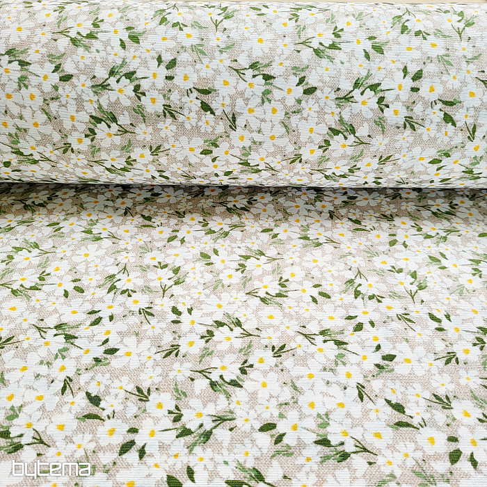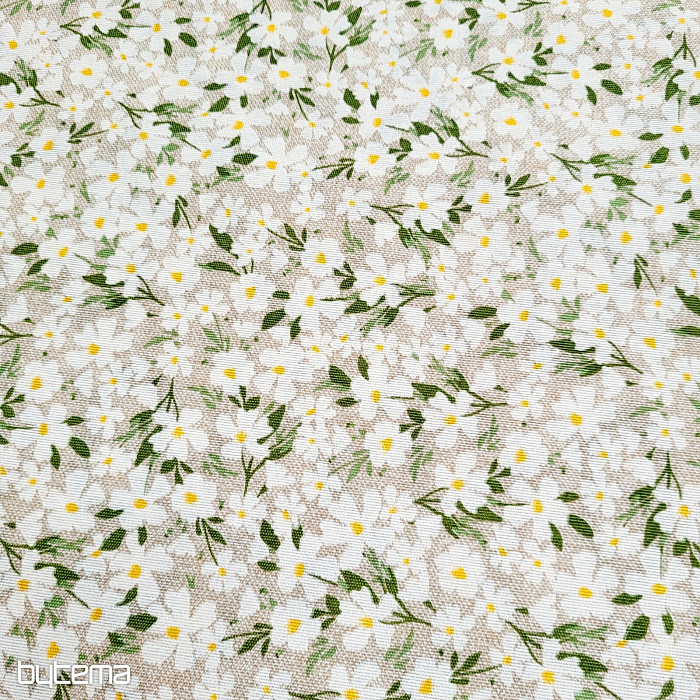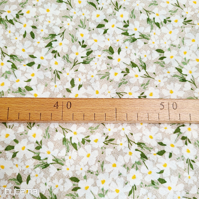 Dekoracyjna tkanina z delikatnymi białymi kwiatami lśni niczym stokrotki.