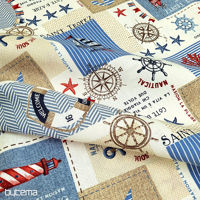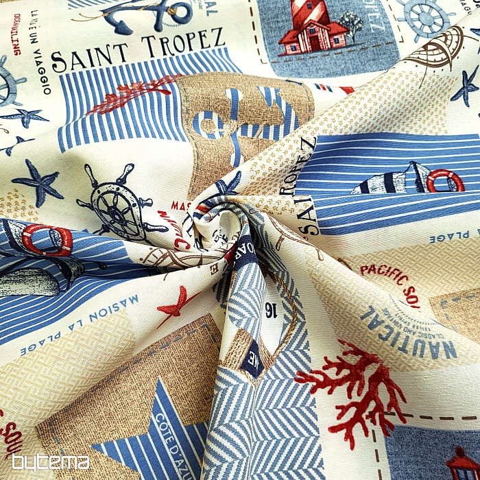 Tkanina dekoracyjna z motywem marynistycznym. Piękna letnia dekoracja dla wszystkich miłośników morza i dalekich krain.