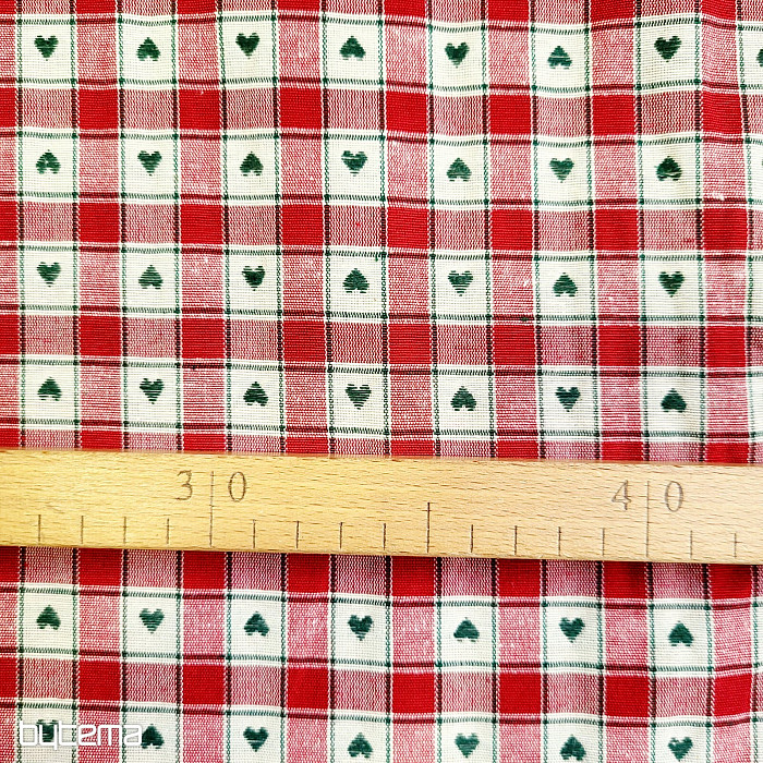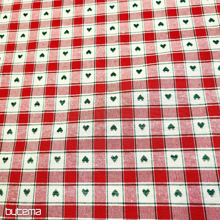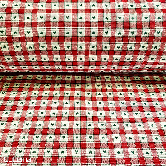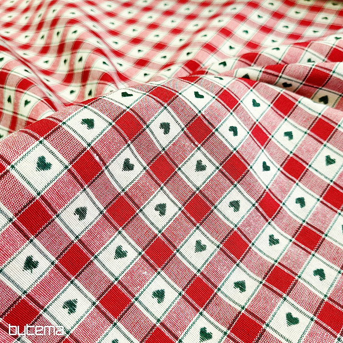 Dekoracyjna tkanina ze wzorem szachownicy i serc doskonale sprawdzi się w wiejskich domkach i chatach z bali.