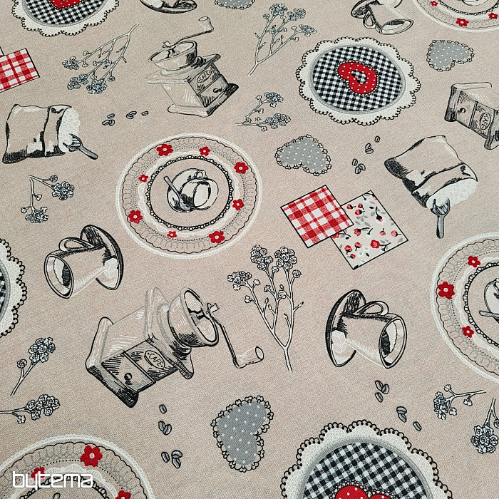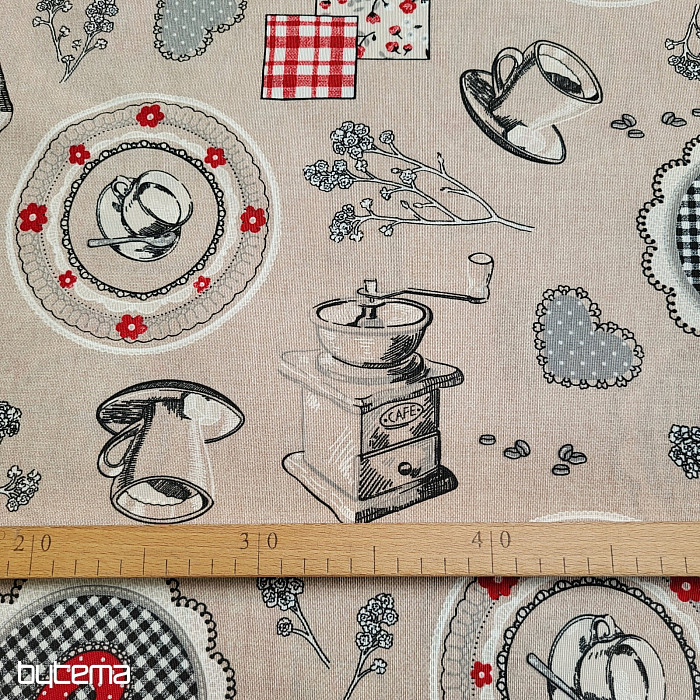 Dekoracyjna tkanina z motywem młynków do kawy i zaparzonej kawy będzie piękną ozdobą Twojej kuchni.