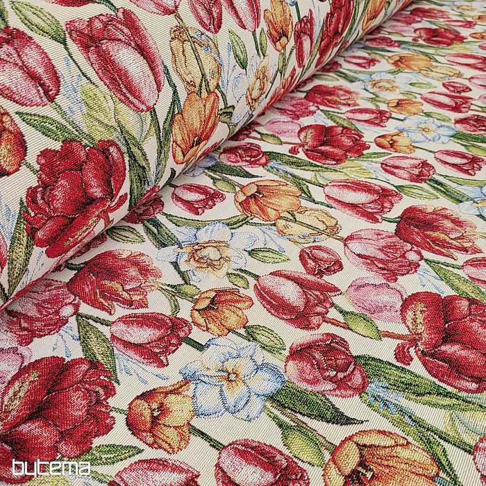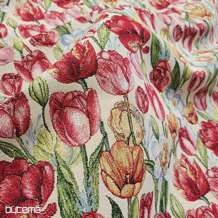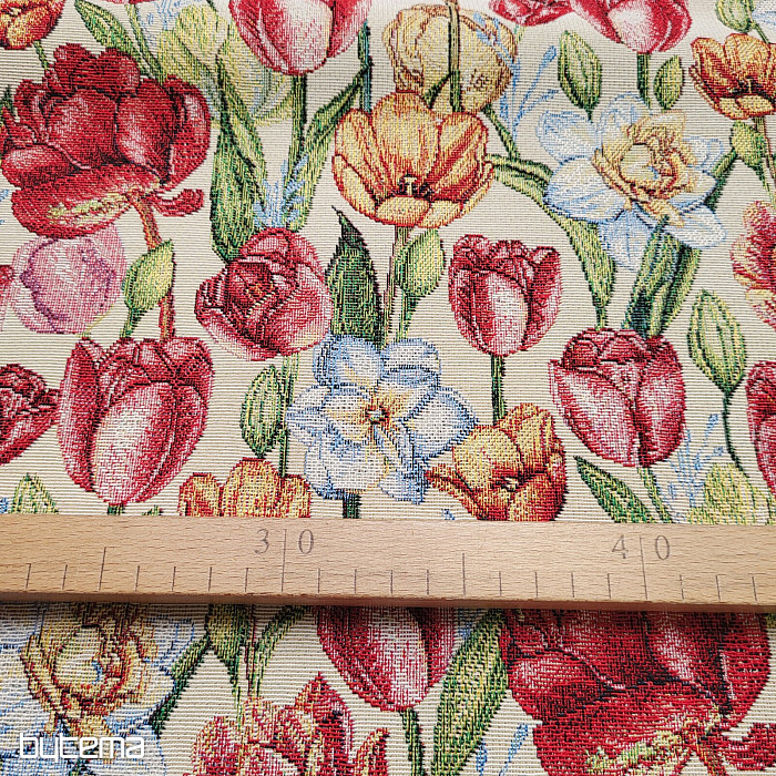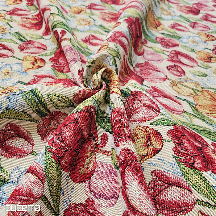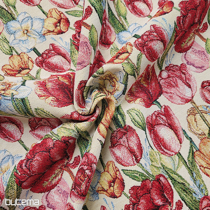 Piękny gobelin z wiosennymi kwiatami – tulipanami i żonkilami. Cudowna, kolorowa powódź kwiatów i wiosny na Twoim stole w domu.