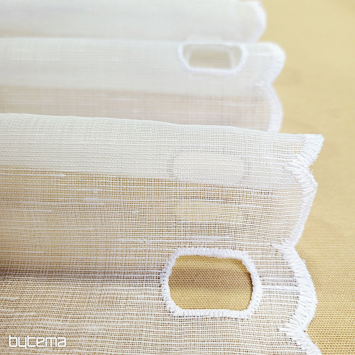 Wszystkie rozmiary posiadają przelotki do nawleczenia na karnisz witrażowy. Zasłona jest cięta na panele, nie wymaga szycia.