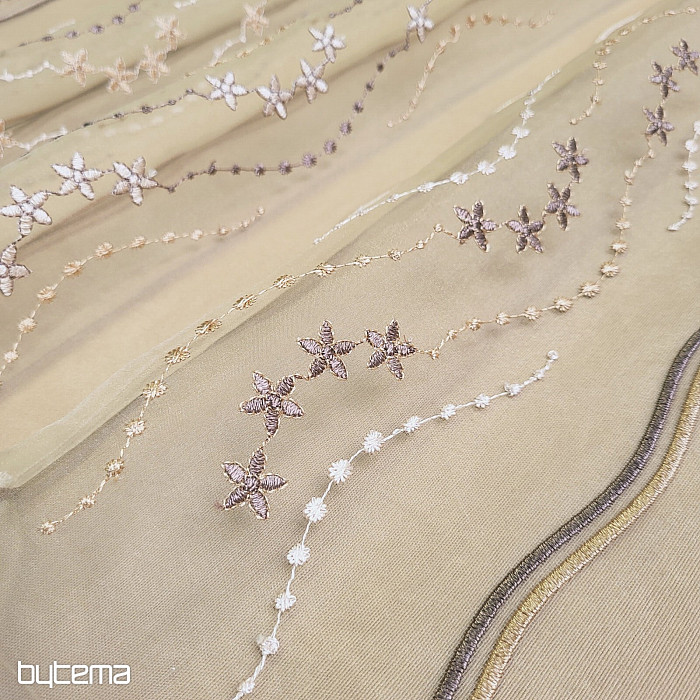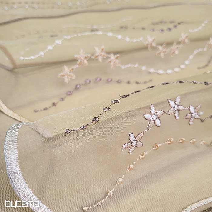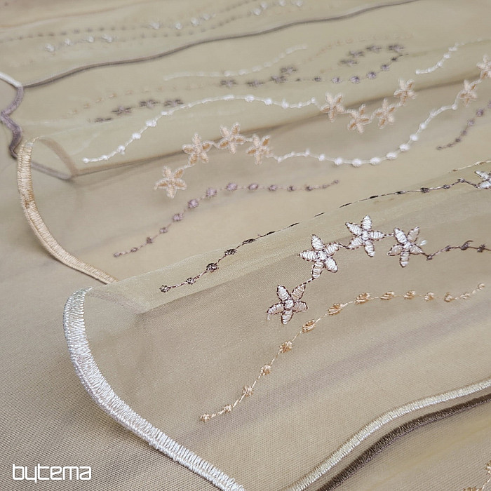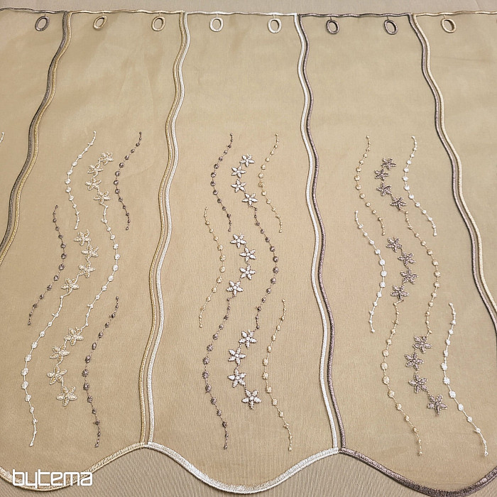 Krótka, nowoczesna, haftowana zasłona witrażowa w kolorze brązowym. Brązowe tło i haftowane kwiaty dodają zasłonie uroku.