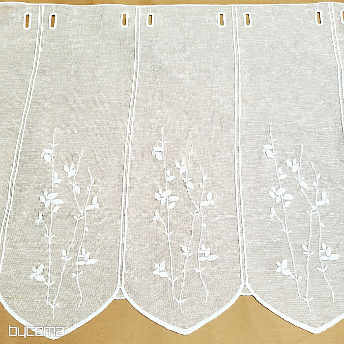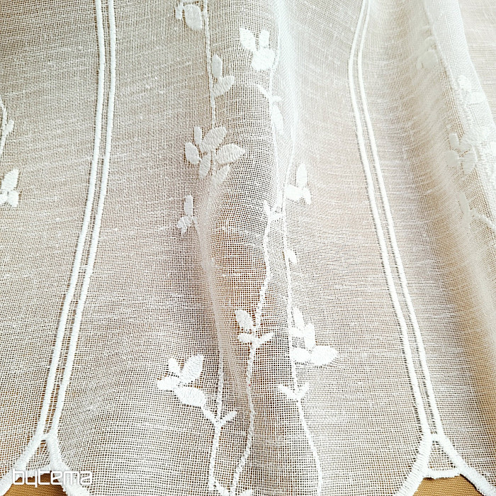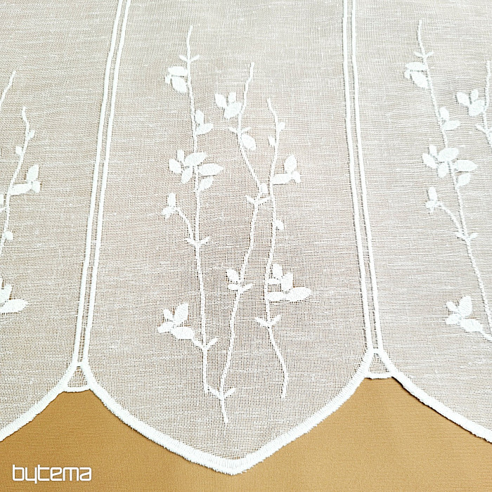 Witrażowa zasłona z delikatnym, nowoczesnym wzorem łodyg i liści w stonowanym odcieniu kremowym od niemieckiego producenta GERSTER to trwała gwarancja jakości.