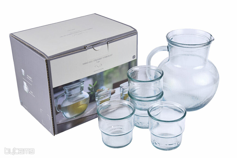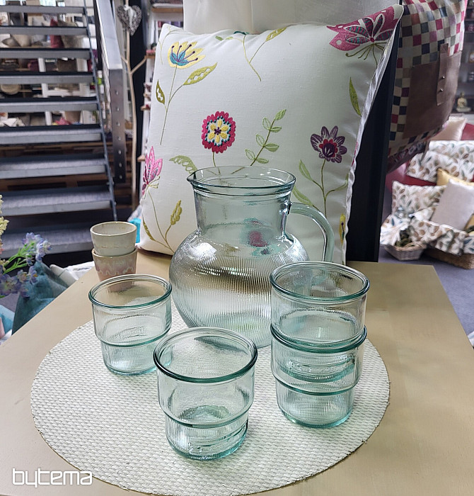 Piękny dzbanek i 4 szklanki w pudełku prezentowym, wykonane w 100% ze szkła pochodzącego z recyklingu. Szkło jest przejrzyste i transparentne. Wykonane z myślą o środowisku i stylu Twojego domu.